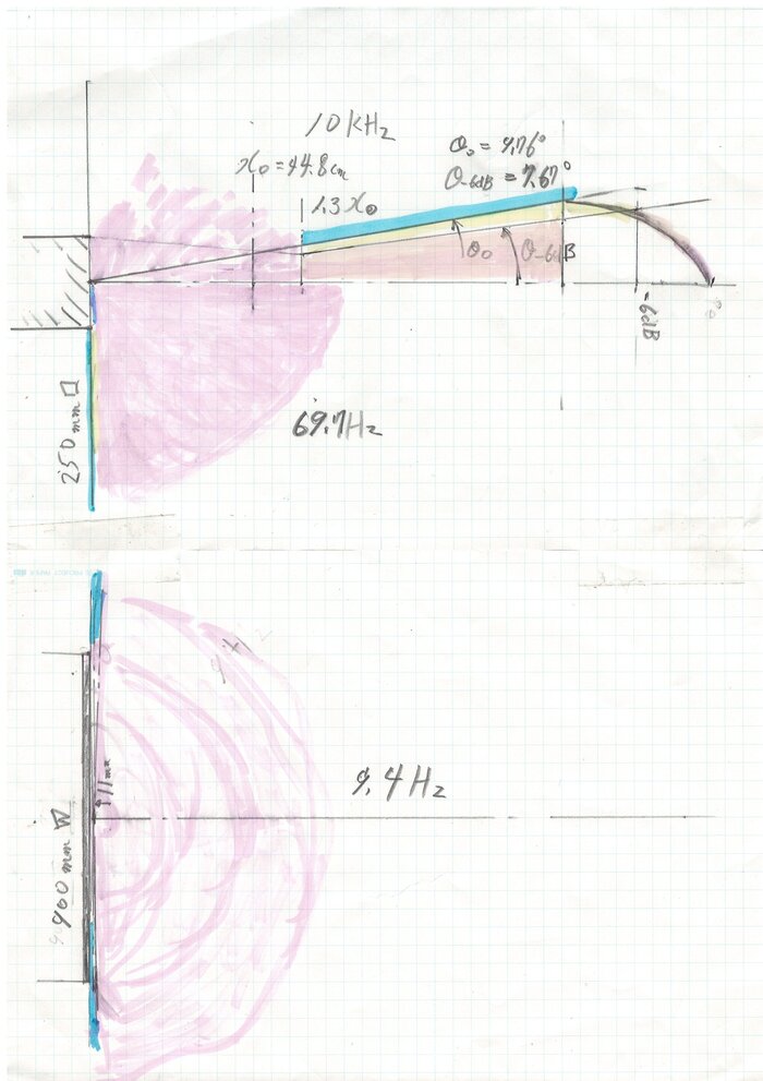 但し、10kHzになると反射波の実効半減指向角(ー6dB)は約7.7°の"狭い"範囲に反射します!(上側半分)