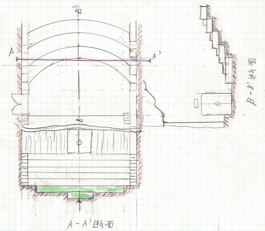 客席を扇形の段床(又はハノ字段床)に配置すると、客席中央部にはすり鉢状の「谷間」が生じて(上図左下)着席状態の「耳元の高さ」は定在波発生層(上図左上)からは外れて定在波の影響を受なくなります。