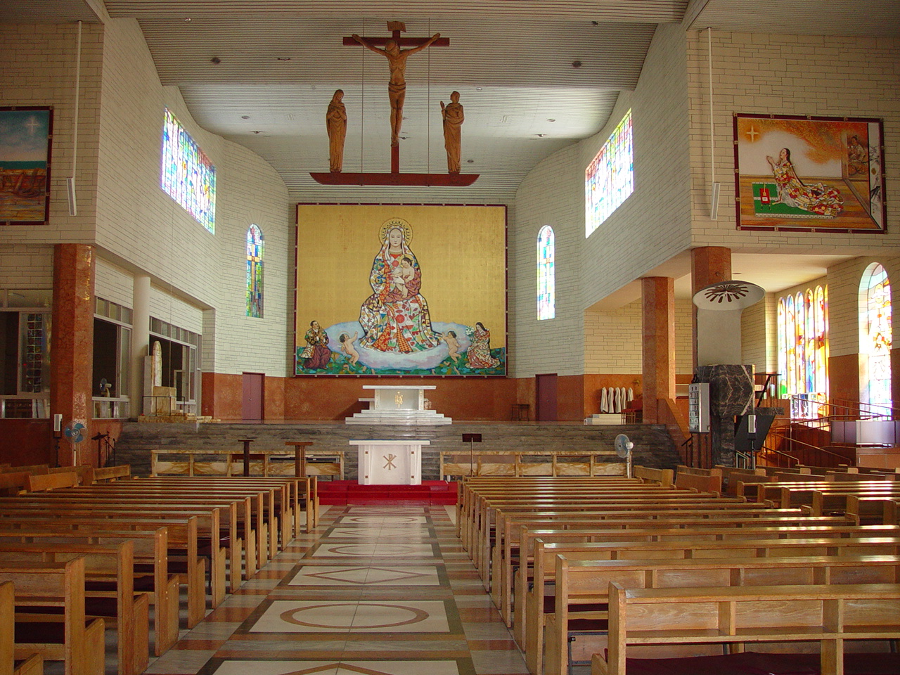 聖堂内部は典型的なカソリック聖堂配置で正面中央に間口10間(約18.2m)x奥行き56尺()の祭壇(ステージ)が設えられ右脇が幅4間(約7.2ⅿ)の列席者壇で、下手にはホール側壁にはみだした6間幅(約11m)x17間(約31m)の小礼拝堂(集会室)が設けられている。